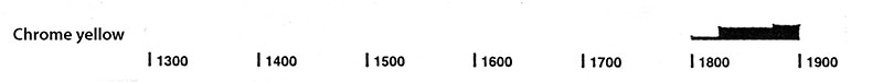 The French chemist Louis Vauquelin discovered the element chrome in 1797. Shortly after the possibility of using lead chromate as a pigment was recognized and the first methods of preparation were invented. Chrome yellow has been in use since the first quarter of the nineteenth century.The following graph gives the frequency of its use in the paintings of the Schack Collection in the Bavarian State Art Collections in Munich (1).Examples of use